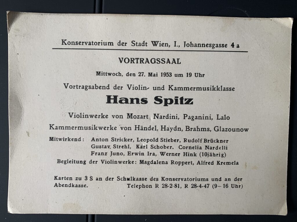 Daneben warst Du am Konservatorium der Stadt Wien. Als Schüler am 27. Mai 1953 um 19:30 gab es dort ein Konzert gemeinsam mit dem so oft erwähnten und irgendwie wohl auch beneideten Toni Stricker. Er hat die Musiklaufbahn eingeschlagen – du bist in der Technik geblieben, die dich – wie du in den letzten Jahren immer wieder betont hast – überhaupt nicht – eigentlich NIE interessiert hat. Ein typisches österreichisches Hätti-Wari-Schicksal!